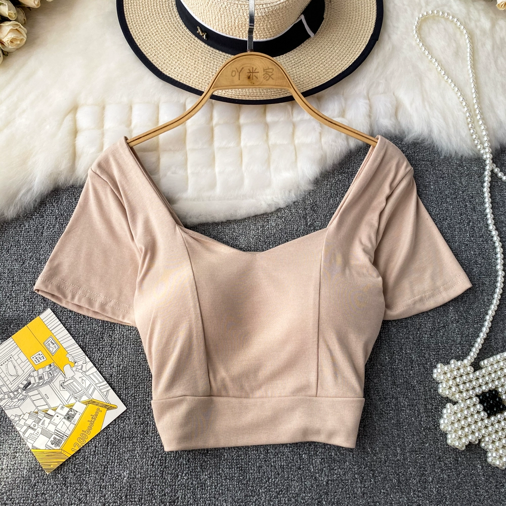 | nameOriginal | Solid color collarbone exposed slim fit top short-sleeved T-shirt |