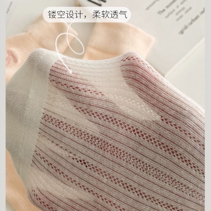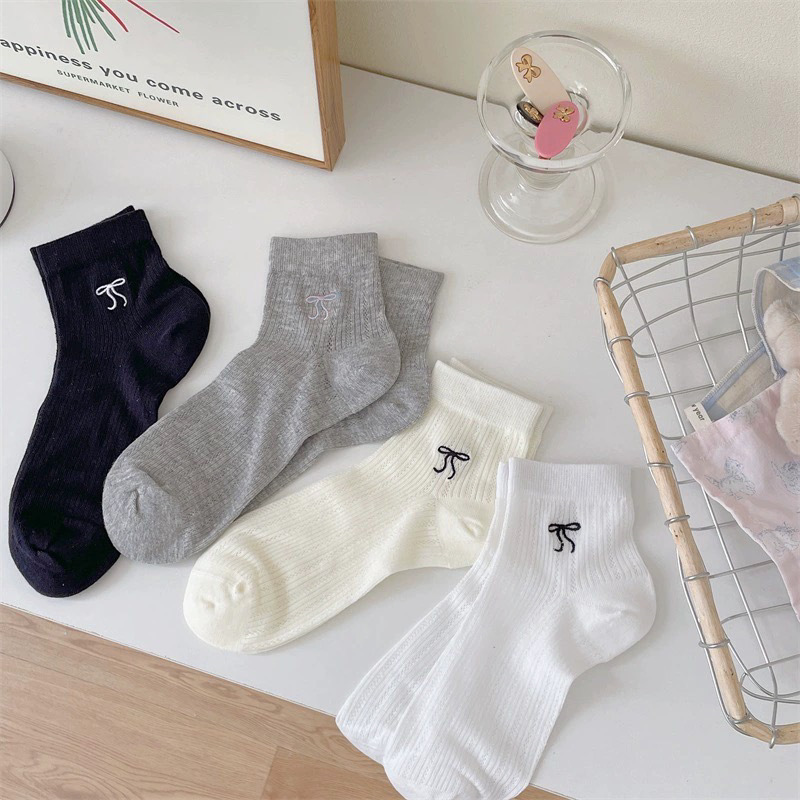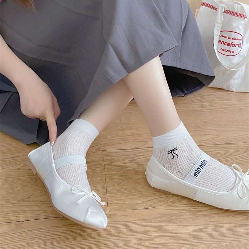 Solid Color Cream Women's Socks Spring and Summer Thin Breathable Short Socks Embroidered Bow Ins Trendy Ballet Style Cotton Socks