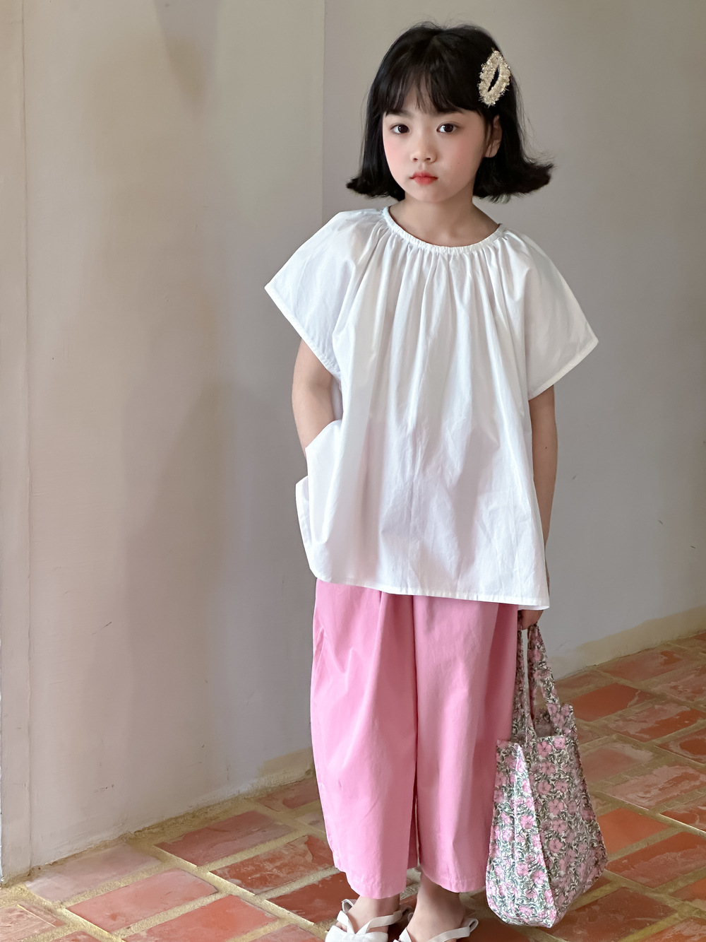 Solid Color Girls' 2024 Summer Short-sleeved Loose Shirt Children's Top Casual Korean-style Small Mon Round Neck Children's Shirt