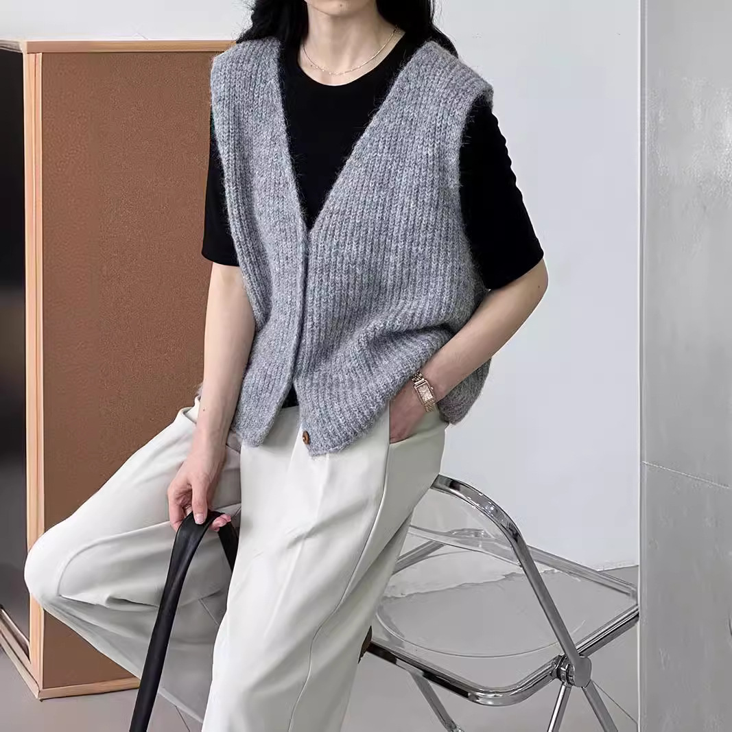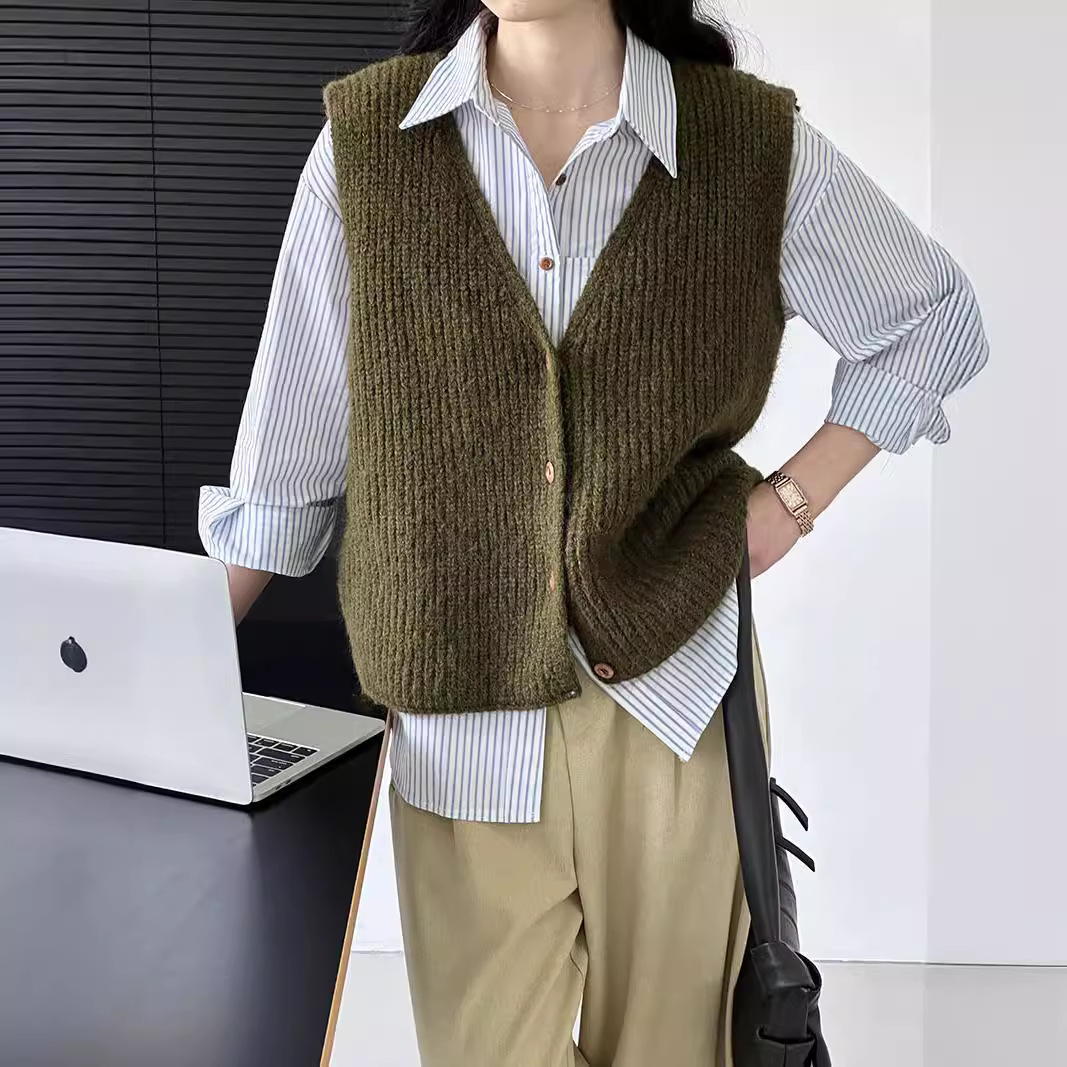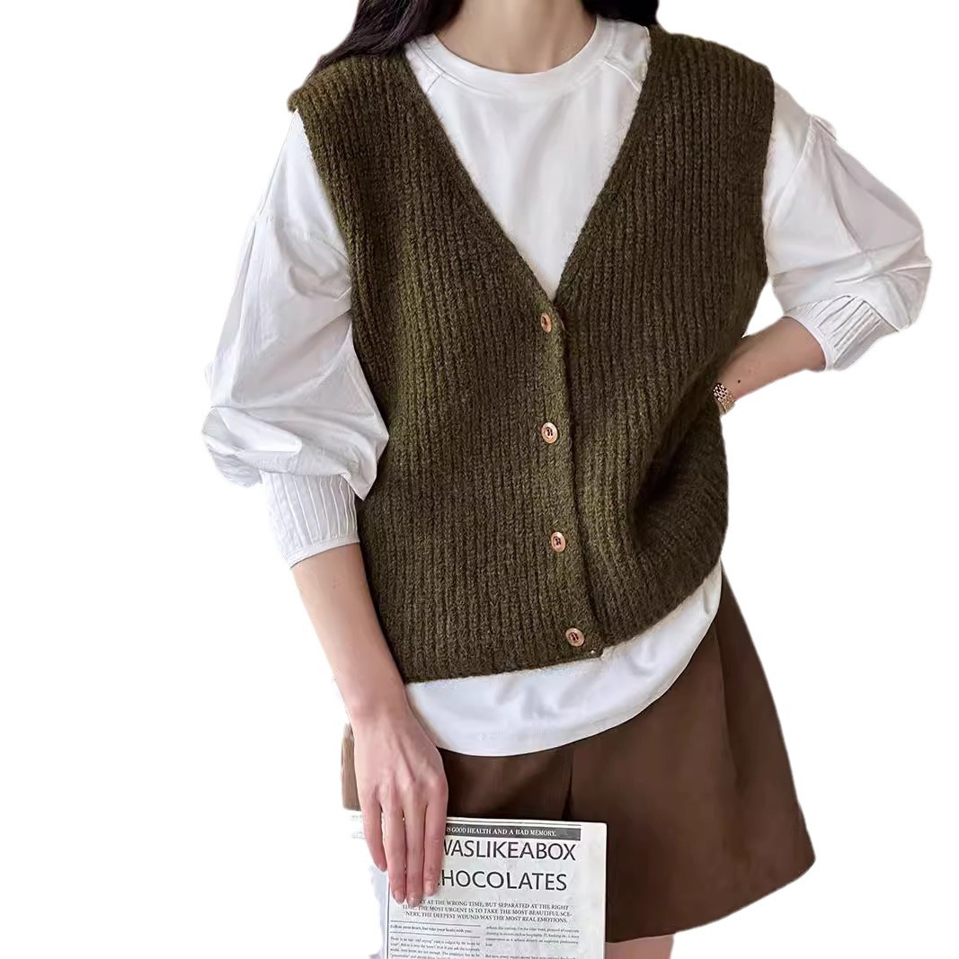 Solid Color Knitted Cardigan Vest Vest Women's 2024 Autumn and Winter New Japanese-Korean Style Simple V-neck Stacked Sweater Outer