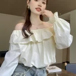 قميص قصير ذو لون خالص ورقبة واحدة فضفاض وأكمام طويلة مكون من قطعتين