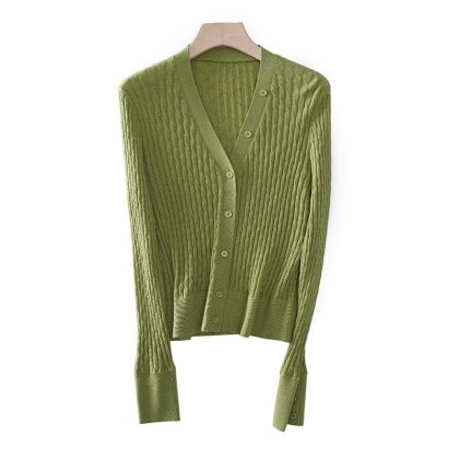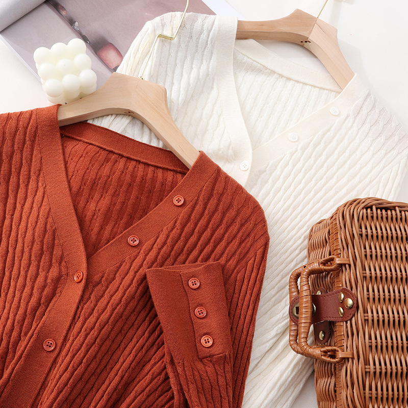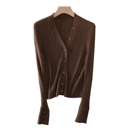 | nameOriginal | Solid Color Vertical Strand Twisted Flower Design 2024 Maillard Style New V-Neck Slim Knitted Cardigan for Women |