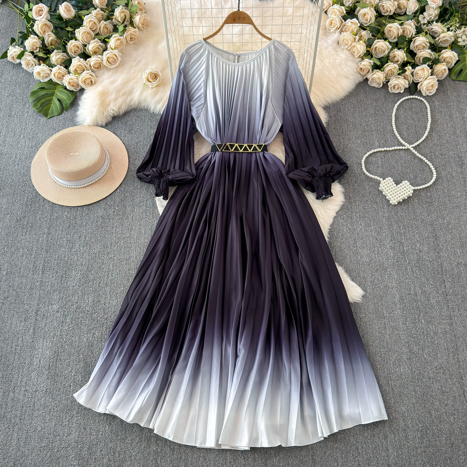 | nameOriginal | Sophisticated and ladylike long-sleeved round neck waist slimming large hem gradient printed pleated A-line dress |