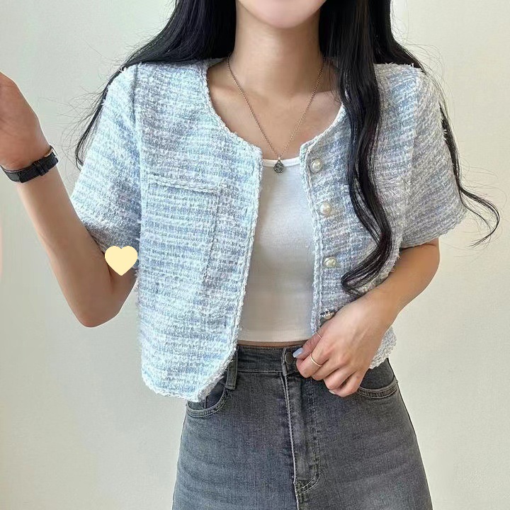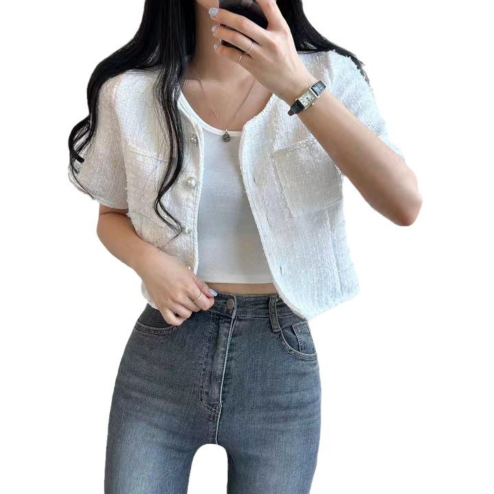 South Korea Chic Summer Age-reducing Temperament All-match Chanel-style Temperament Short-sleeved Slub Short Small Cardigan Jacket for Women