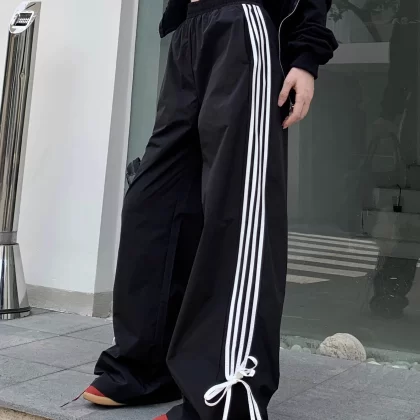 | nameOriginal | Sporty loose high-waisted floor-length trousers with bow ties |