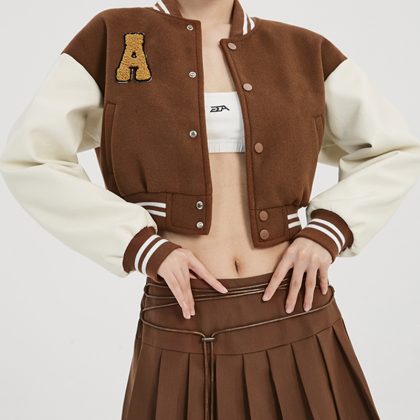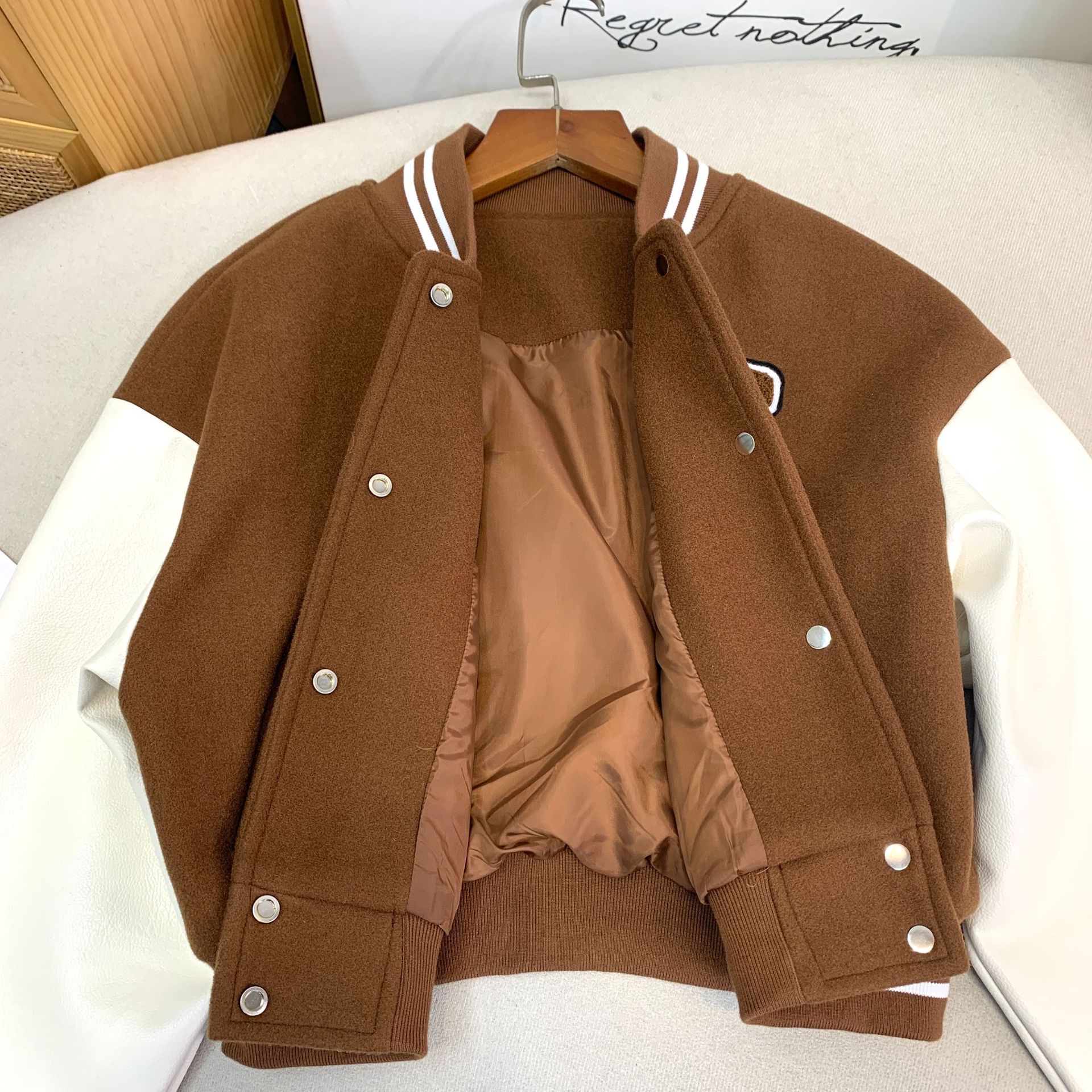 بقعة الخريف خمر فتاة ساخنة شخصية الأمريكية البني الأبيض خياطة قصيرة زي بيسبول موضة جديدة النمط الغربي معطف المرأة