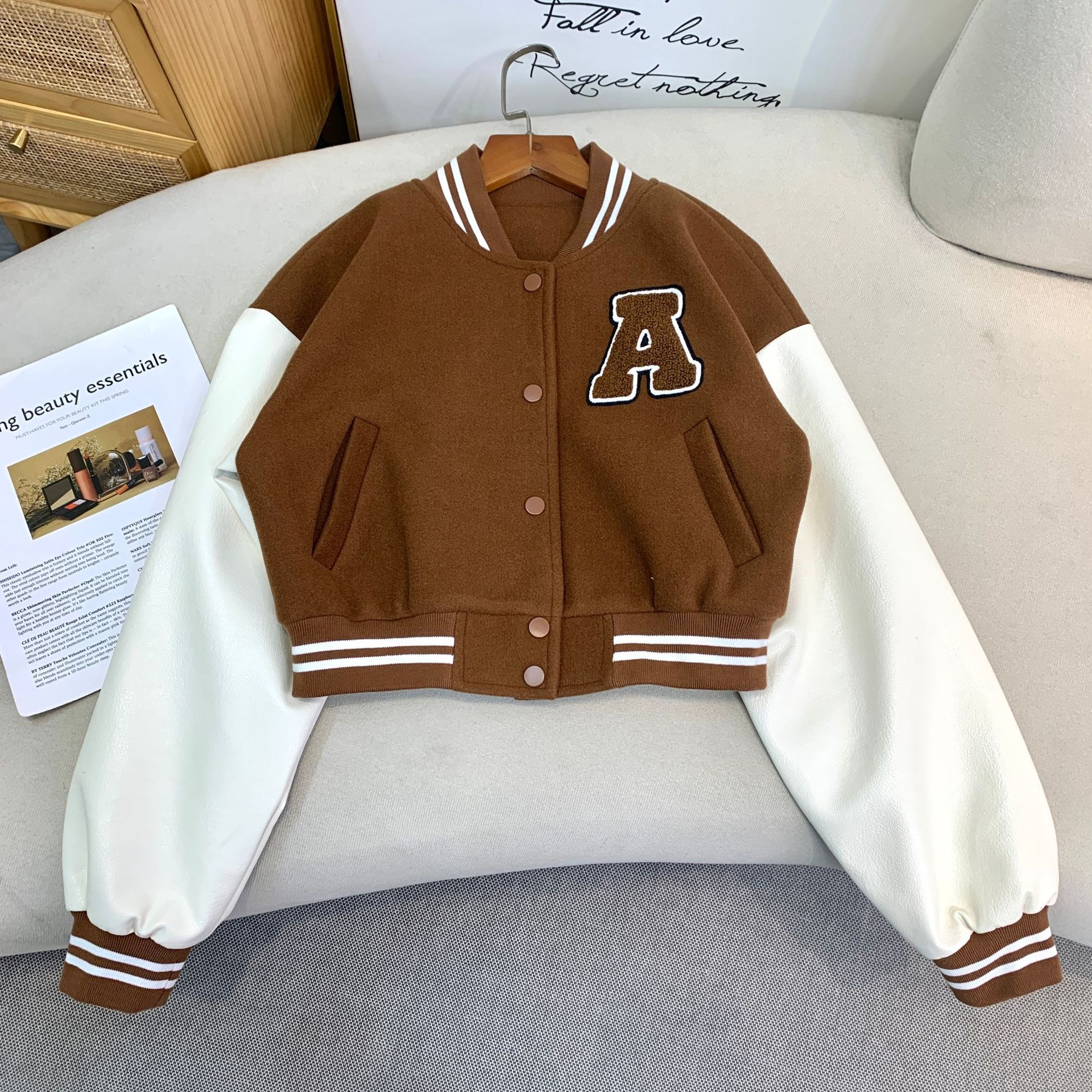 Spot autumn vintage hot girl personality American Brown white stitching short baseball uniform new fashion Western style coat women