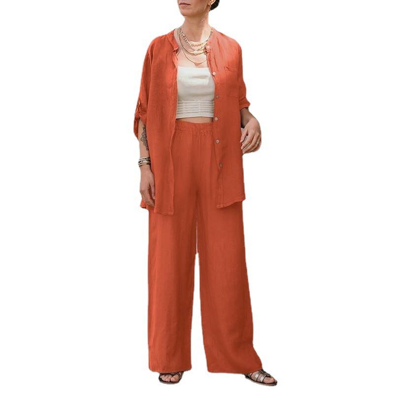 | nameOriginal | Spring 2023 New European and American Cross-border Casual Suit Solid Color Lapel Long Sleeve Shirt Top Pants Two-piece Set |