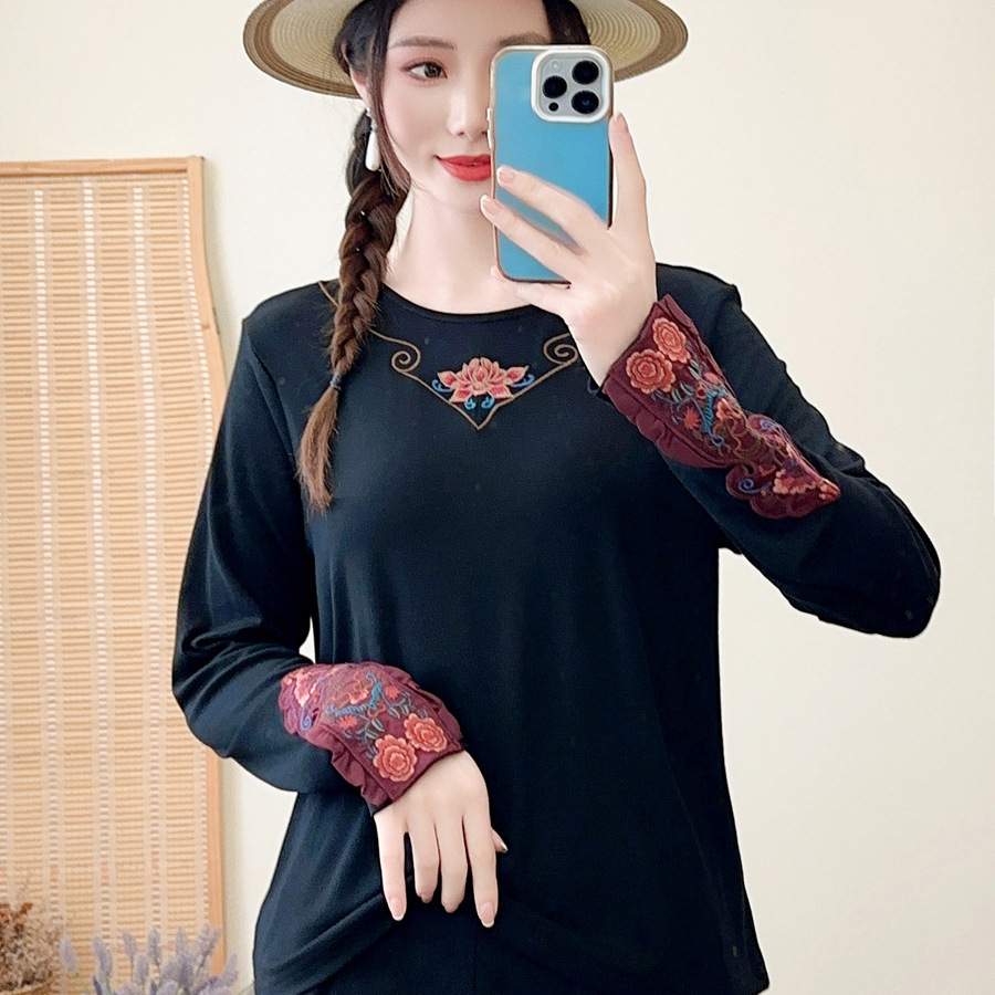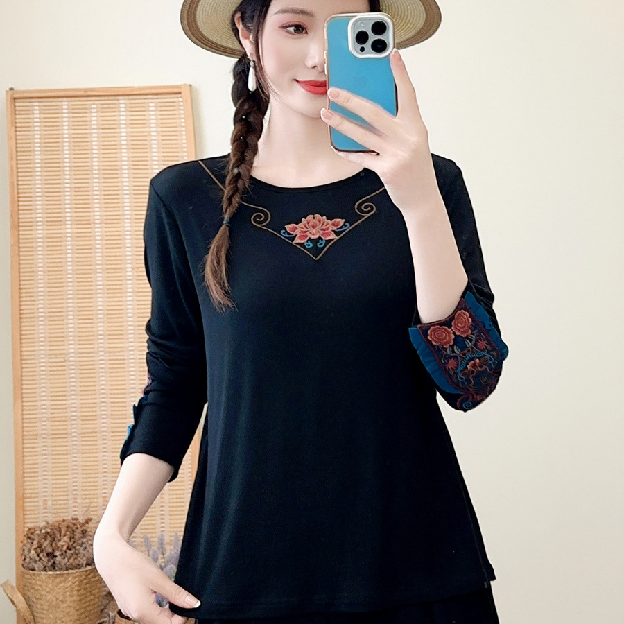 | nameOriginal | Spring 2024 women's ethnic style patch embroidered cuff solid color stretch modal cotton women's round neck bottoming shirt |
