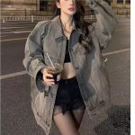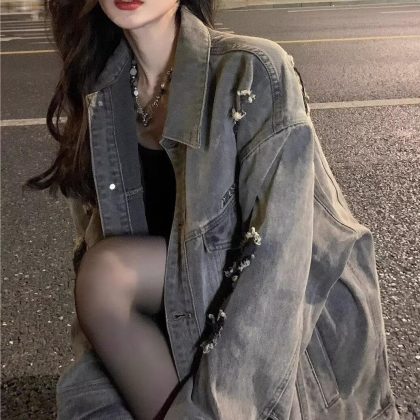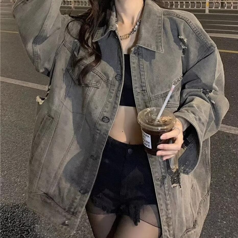 الربيع والخريف النمط الأمريكي الرجعية الدنيم سترة معطف المرأة 2023 جديد فضفاض كل مباراة غسلها ممزق سترة العصرية