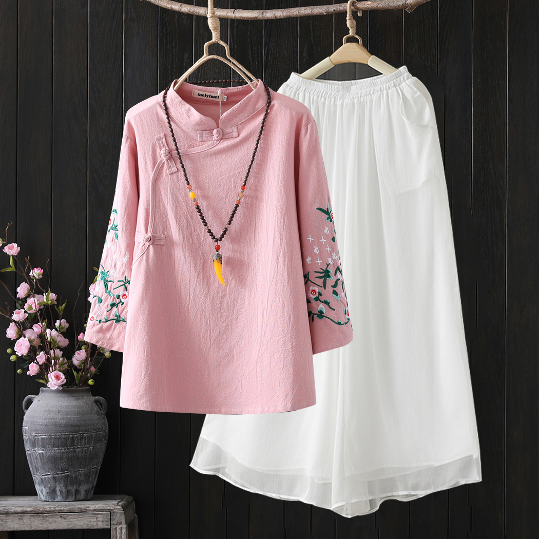 | nameOriginal | Spring and Summer 2024 Ethnic Style Vintage Artistic Cotton and Linen Top Women's Embroidered Shirt Chinese Style Pan Button Zen Tea Clothes |