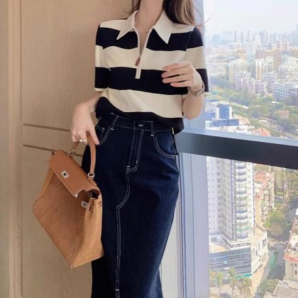 Spring and Summer 2024 New Seagull Polo Shirt Texture Pearl Cotton Urban Fashionable Contrast Striped Short Sleeve Top for Women