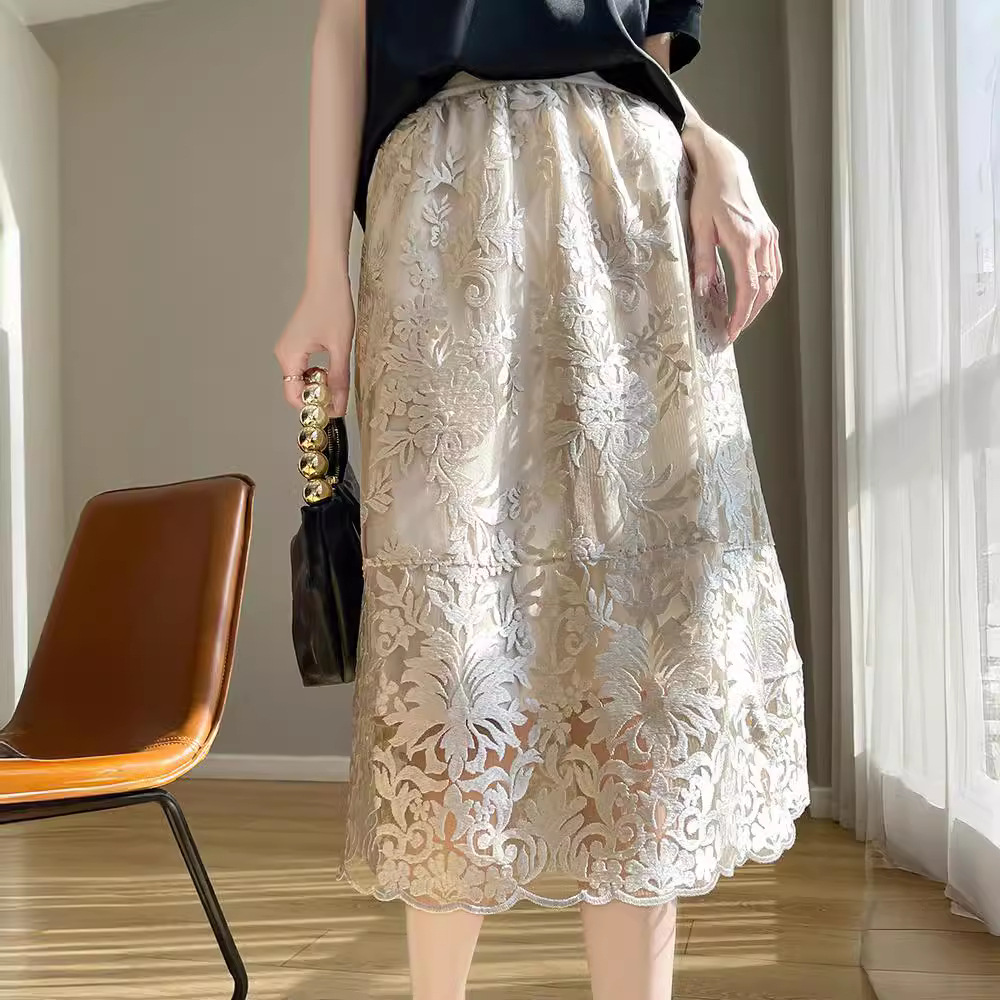 | nameOriginal | Spring and summer 2024 new style embroidery heavy industry fashion elastic waist A- shaped large pendulum long mesh skirt tide |