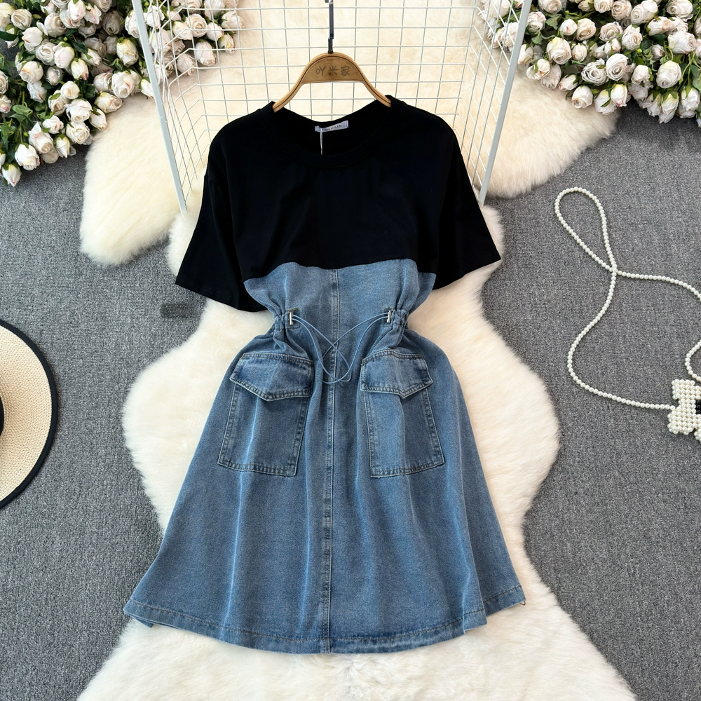 | nameOriginal | Spring and summer Korean fashion fake two-piece short-sleeved round neck patchwork waist slimming mid-length A-line denim dress |