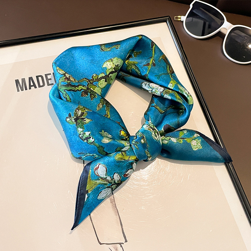 Spring and Summer New Silk Scarf Women's Apricot Tree White Collar Professional Elegant Scarf Ribbon Oil Painting Style Printed Small Square Scarf