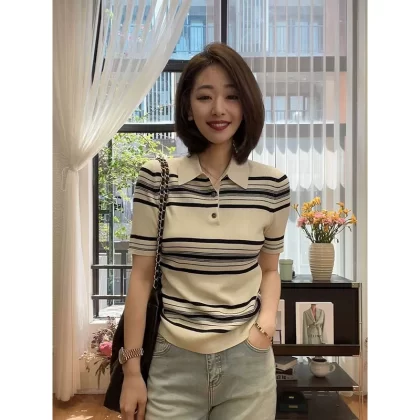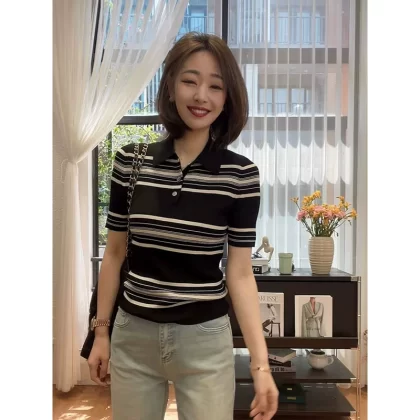 | nameOriginal | Spring and summer polo collar striped tencel short-sleeved sweater |