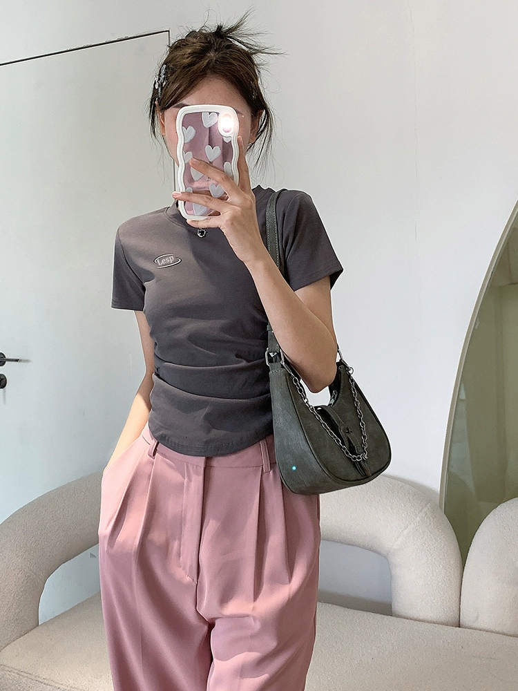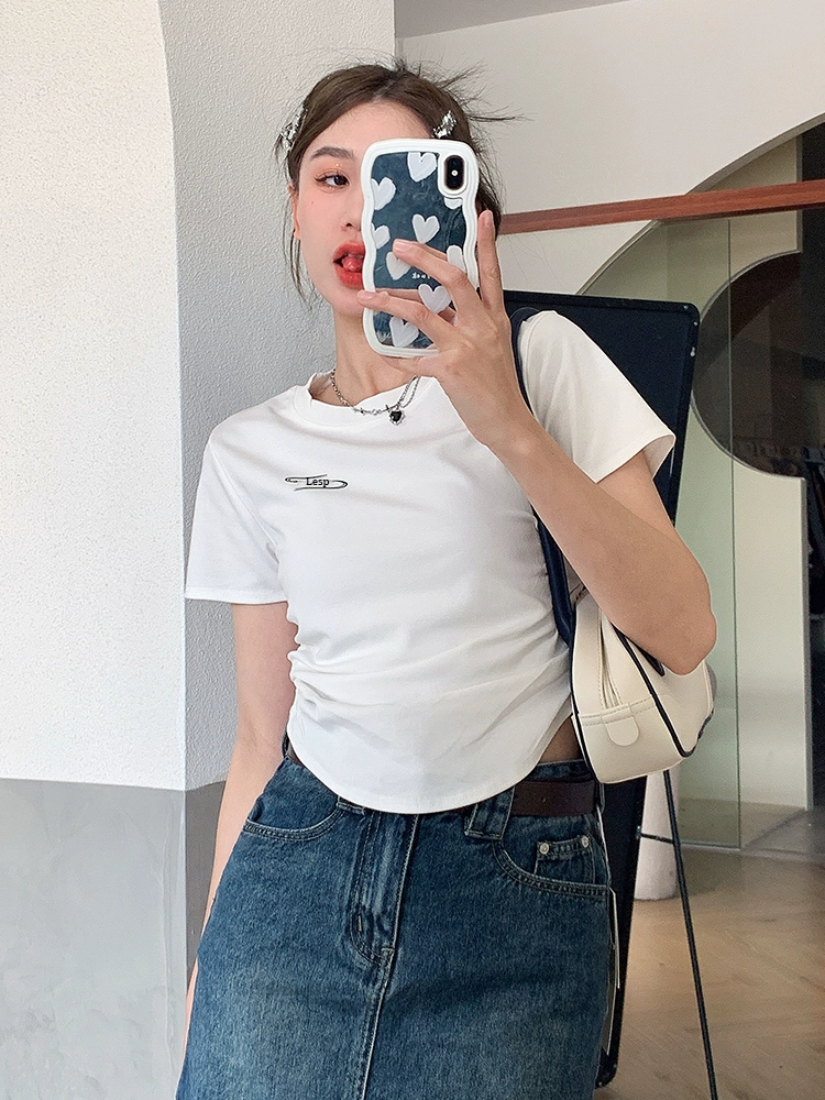 Spring and summer slim-fit pure cotton pleated top short-sleeved T-shirt