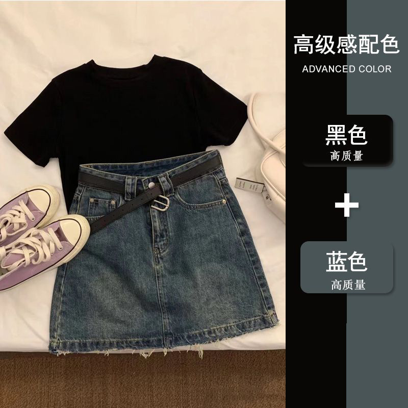 | nameOriginal | Spring fashion age-reducing suit women 2024 new plus size slightly fat slim T-shirt short sleeve Denim skirt two-piece set |