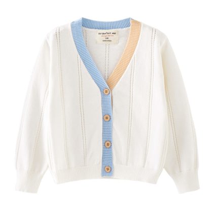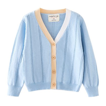 Spring Girls' Knitted Cardigan Jacket Korean Style Baby V-Neck Contrast Color Baby Hollow Sunscreen Air Conditioned Shirt Summer Thin