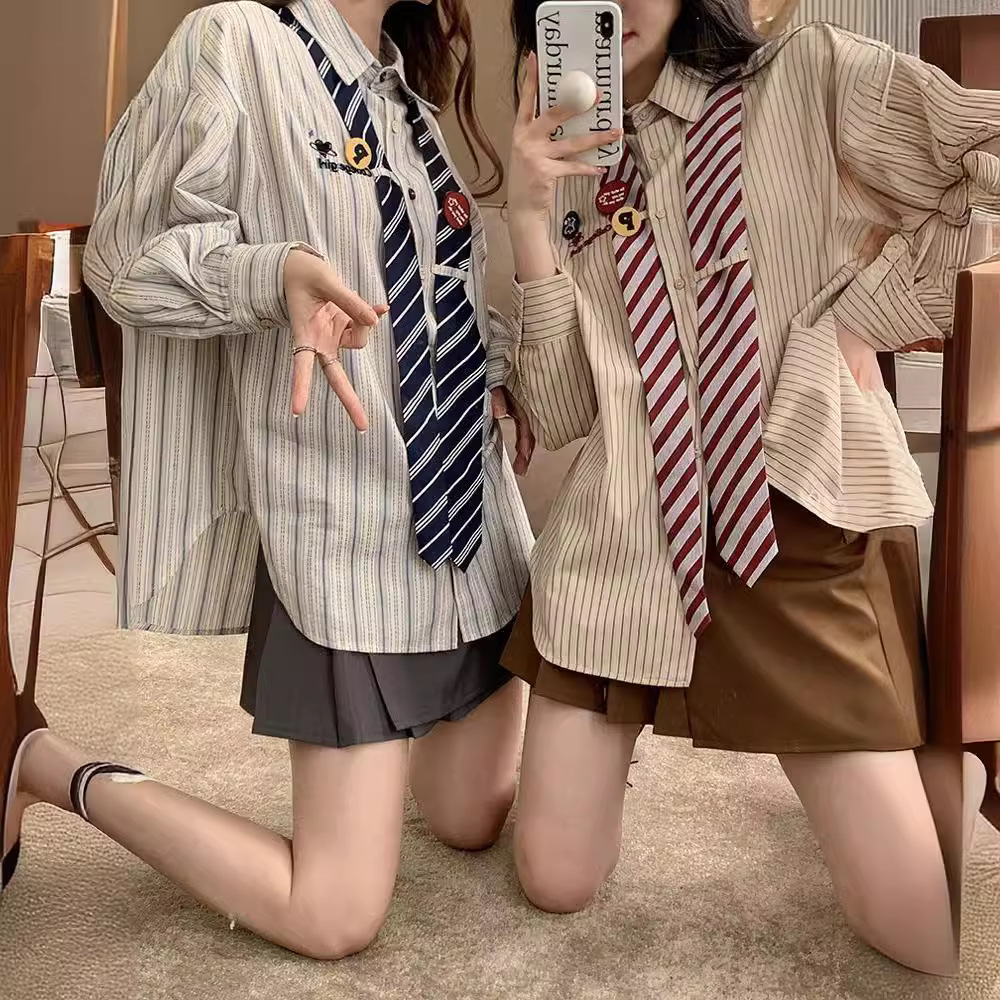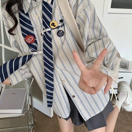 | nameOriginal | Spring striped shirt preppy style loose vintage American design slim fit sweet cute tie long sleeve top |
