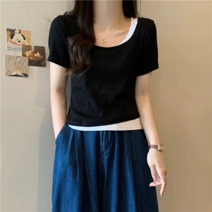 nameOriginal | Square collar contrasting color short T-shirt for women 2023 summer new design niche fake two-piece slim short-sleeved top trendy |