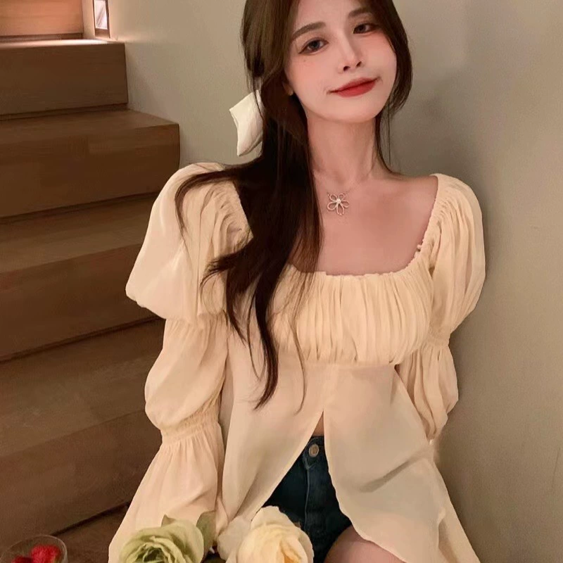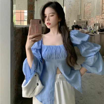 Square collar top women's French retro niche summer irregular long-sleeved slit lantern sleeve thin blue shirt trendy