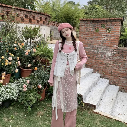 سترة محبوكة مكدسة، مريلة شبكية، طقم من الدانتيل مكون من أربع قطع