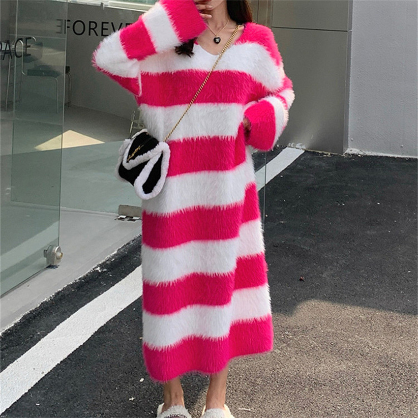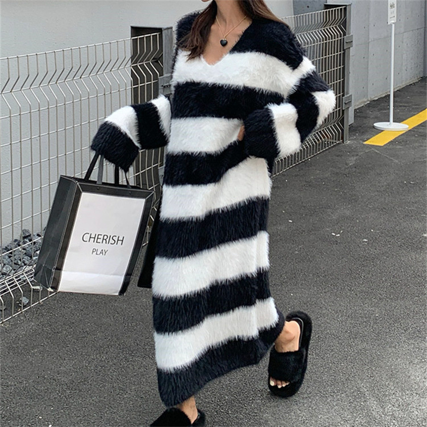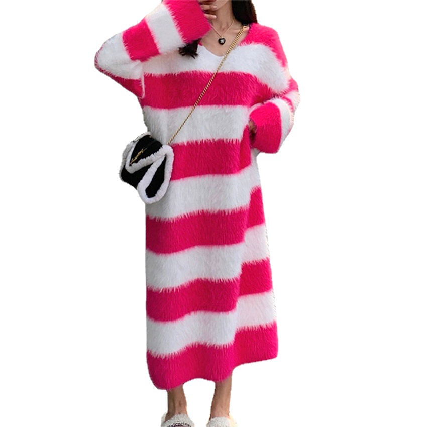 | nameOriginal | Striped Mink Hair V-Neck 2023 Autumn and Winter New Women's Loose Lazy Style Long Over-Knee Slimming Elegant Knitted Dress |