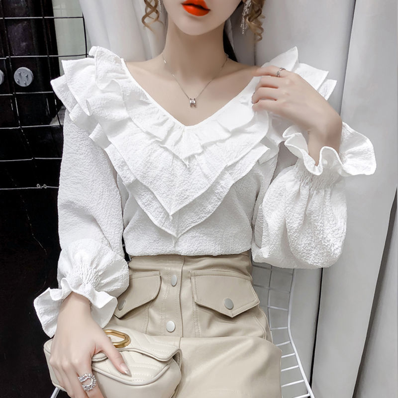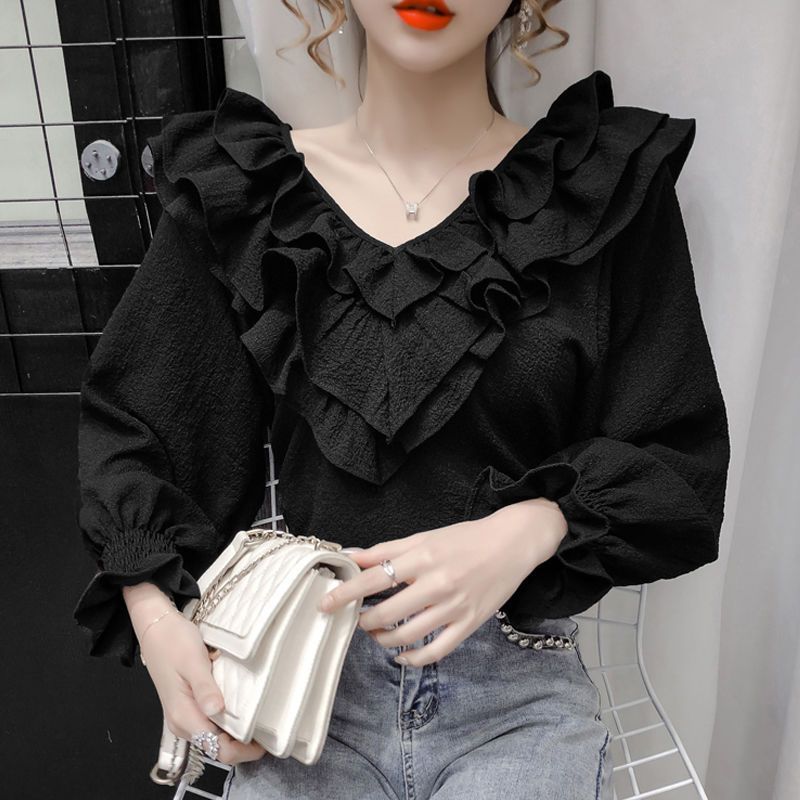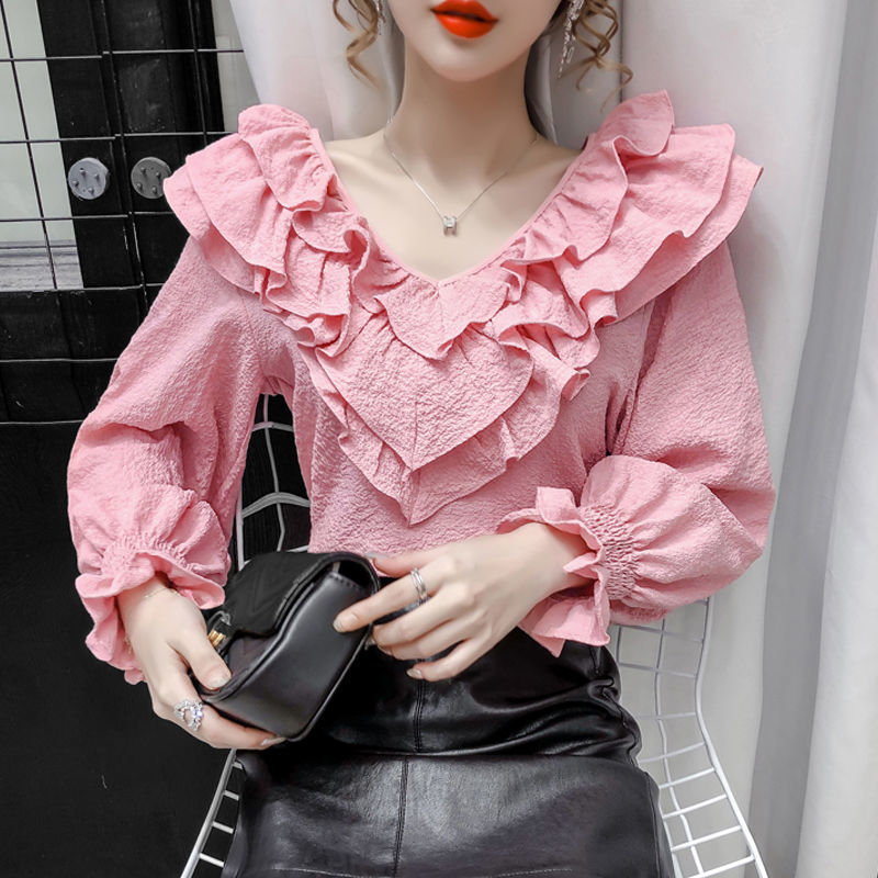 Stylish Ruffled Long-sleeved Chiffon Shirt Women's 2024 Spring New Korean Style Loose plus size Slim Fashionable Top
