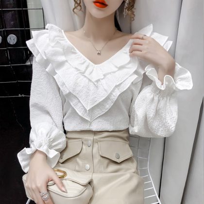 قميص شيفون أنيق مكشكش بأكمام طويلة للنساء 2024 ربيع جديد نمط كوري فضفاض حجم كبير قمة عصرية نحيفة