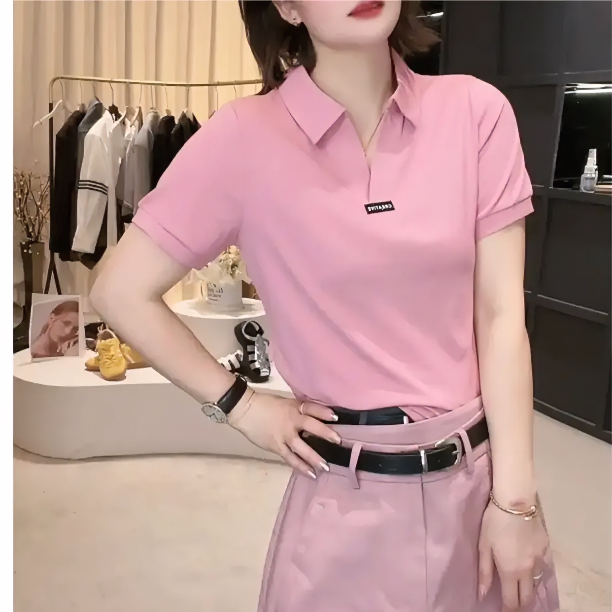 قميص بولو صيفي أنيق بياقة بولو بلون سادة ومناسب لعمر القميص تصميم عصري مناسب لجميع المناسبات بأكمام قصيرة وقصة ضيقة للنساء