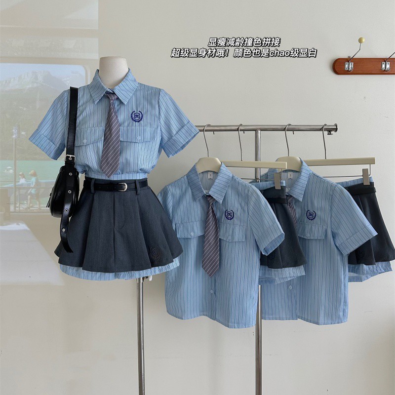 | nameOriginal | suit Women's 2023 Summer New Academic Style Korean Style Design Sense Striped Short-sleeved Shirt High Waist Slimming Skirt |