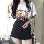 | nameOriginal | Summer 2023 new short-sleeved T-shirt for fat mm women, loose, belly-covering, slimming, large size, right shoulder V-neck, chic Hong Kong style top |