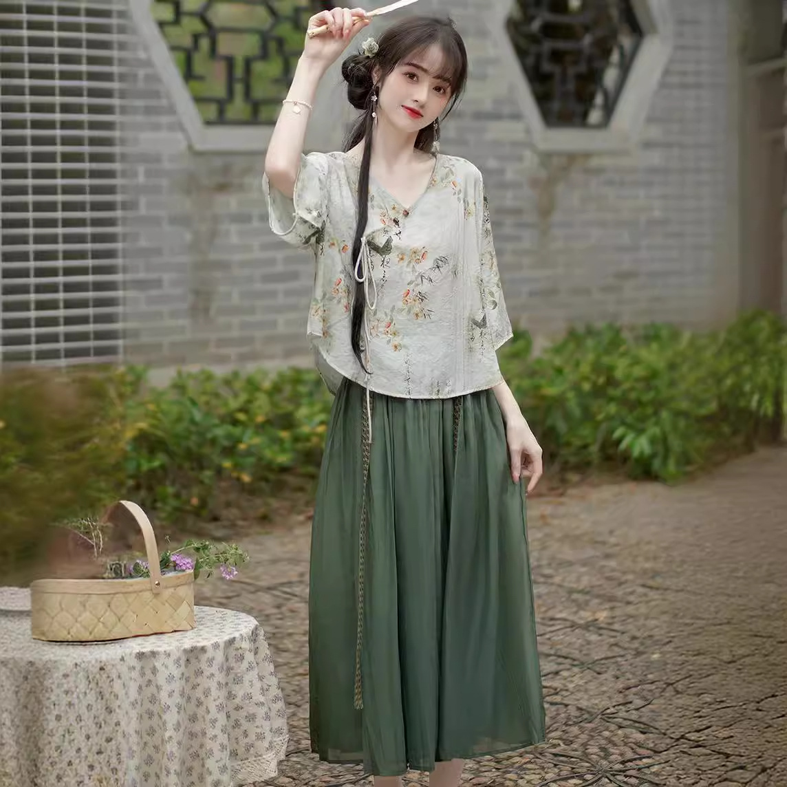 Summer 2024 New Chinese Style Retro Chinese Element Printing Modified Tang Suit Hanfu Top Skirt Zen Tea Clothes suit