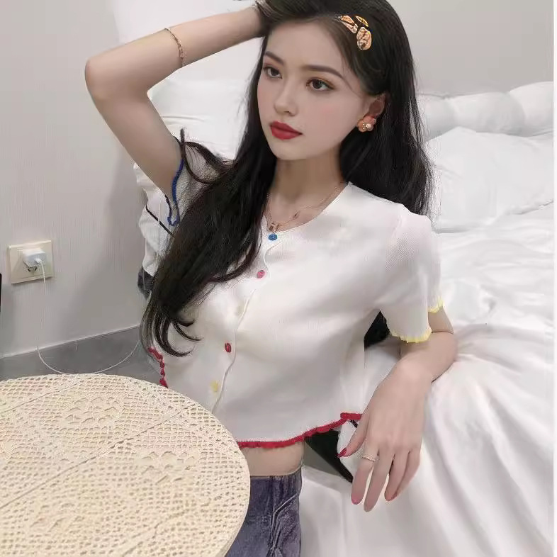 | nameOriginal | Summer 2024 New Ice Silk Knitted Cardigan Short-sleeved T-shirt Women's Colorful Buckle Short High Waist Slim Top |