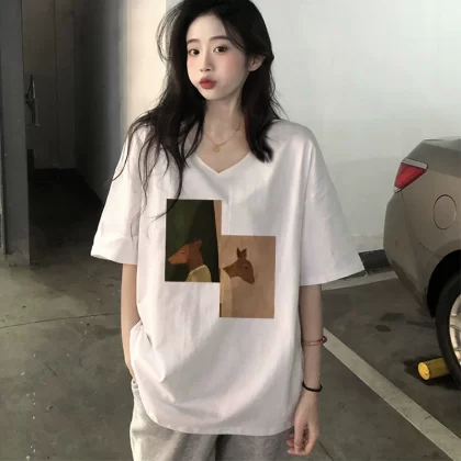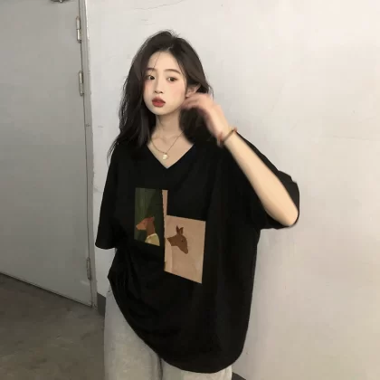الصيف السوداء السوداء الأمريكية القطن الرجعية قصيرة t -sleeved t -shirt جديدة v -لا يمكن أن تكون ملابس النساء كبيرة الحجم كبيرة الحجم