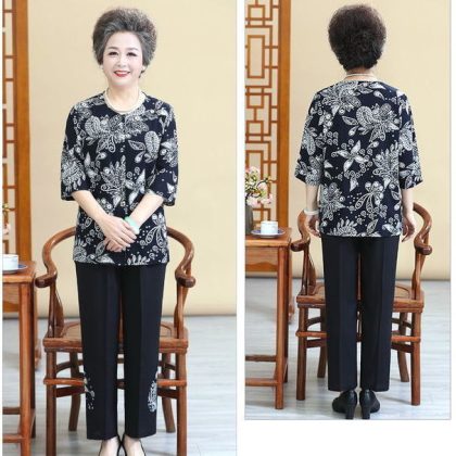 ملابس الصيف لكبار السن في منتصف العمر وفساتين الجدة بدلة من القطن والكتان المقلد تي شيرت للأم بأكمام قصيرة من 60 إلى 70 عامًا لكبار السن