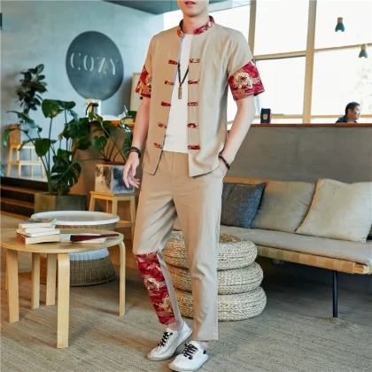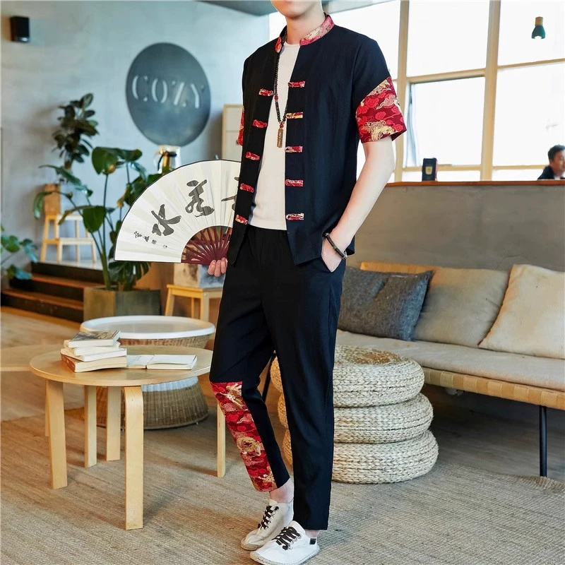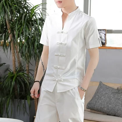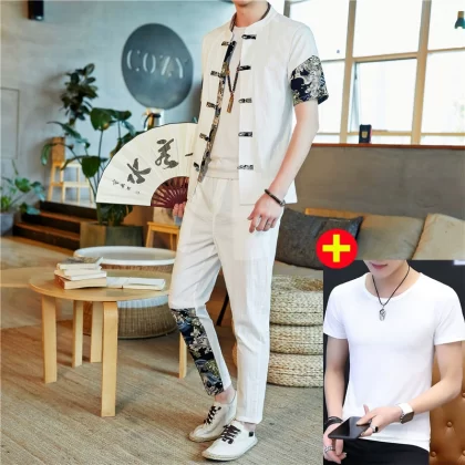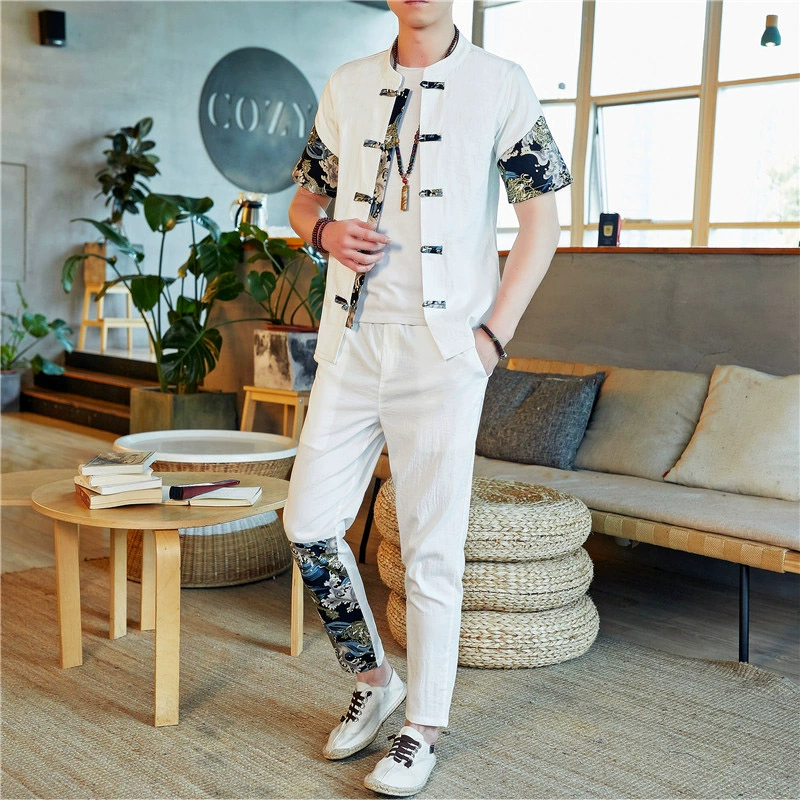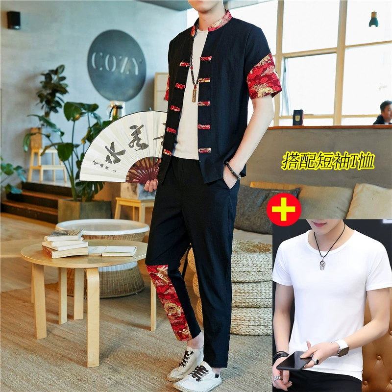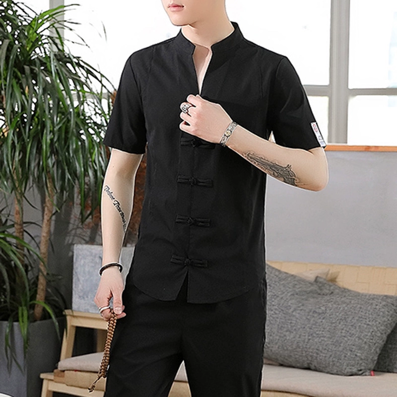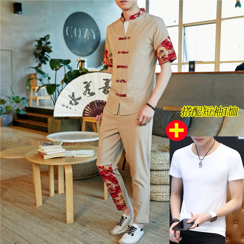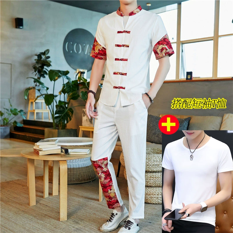 Summer cotton and linen short-sleeved suit for men, Chinese style Tang suit cardigan, buckle Hanfu, ancient style ice silk stand-up collar, Chinese tunic suit trend