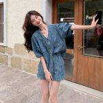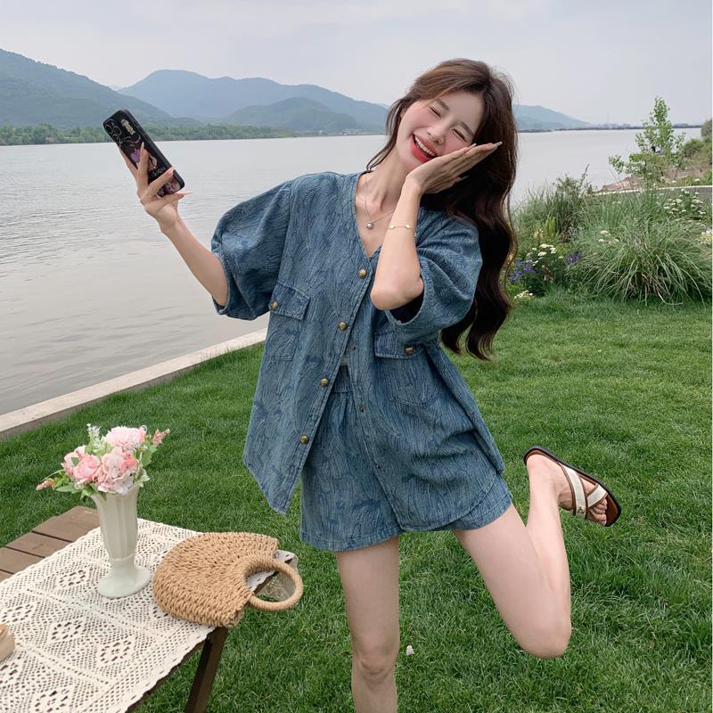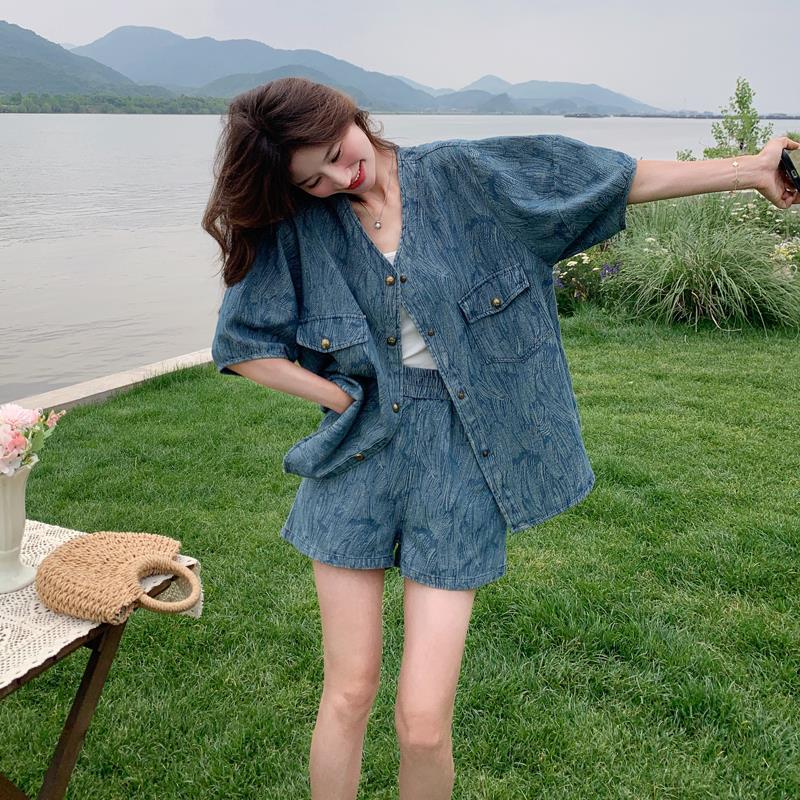 | nameOriginal | Summer Dress with a Set of Fashion Denim suit Women's Hong Kong Style Retro Jacquard Loose V-neck Shirt Shorts suit |