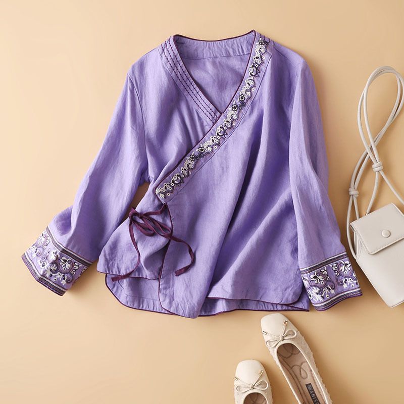 Summer ethnic style women's cotton and linen diagonal embroidered top artistic retro loose improved Hanfu ancient style tea Zen clothing