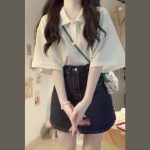 Summer Little Milk Wear White Polo Collar Short-sleeved T-shirt Denim Half-length Skirt Age-reducing Two-piece Suit