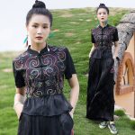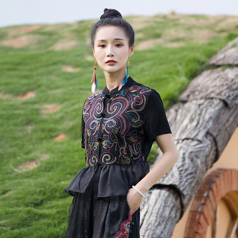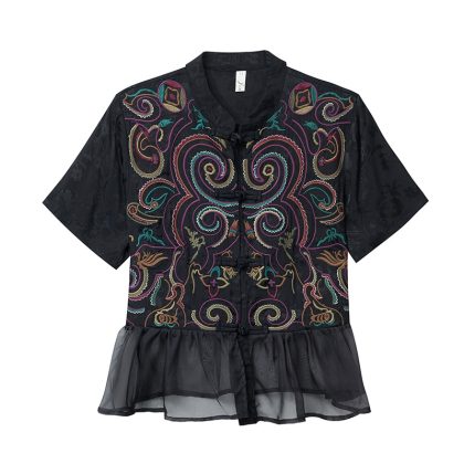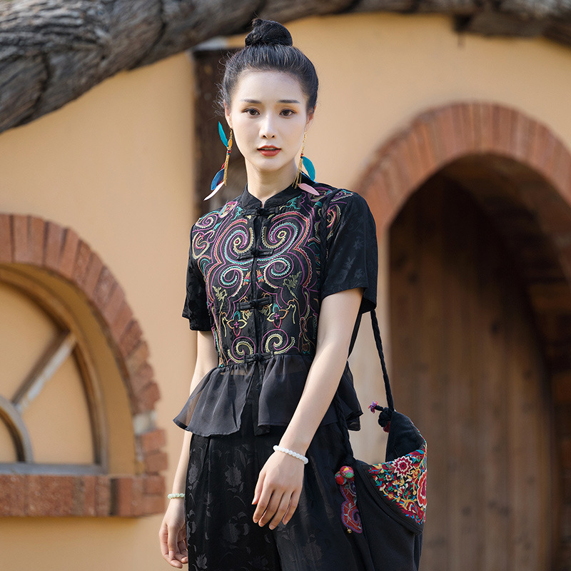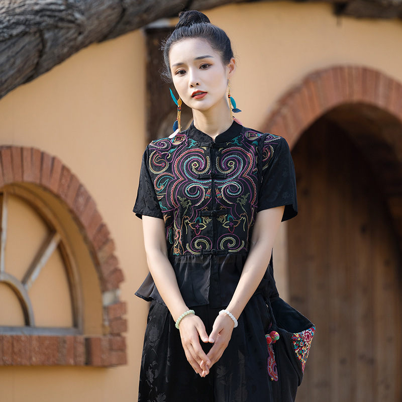 nameOriginal | Summer New Ethnic Style Women's Clothing Jacquard Satin Heavy Embroidered Cardigan Niche Padded Embroidered Short-sleeved Blouse |