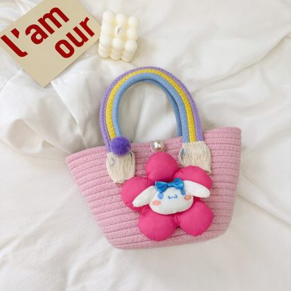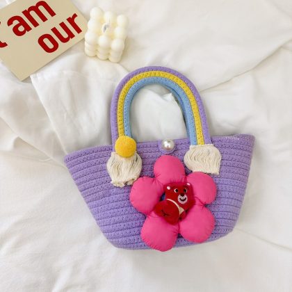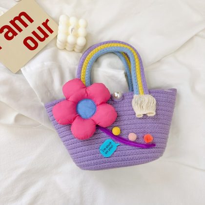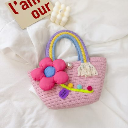 حقيبة أطفال منسوجة صيفية جديدة على الطراز الكوري حقيبة يد بفيونكة حلوة للفتيات في الهواء الطلق تحمل سلة النزهة