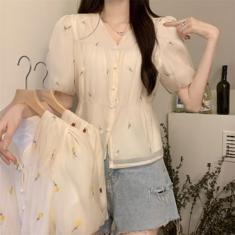 | nameOriginal | Summer New French Embroidered Puff Sleeve Niche Age-reducing Western Style All-match Casual Chiffon Shirt Top Women's Meat Covering |