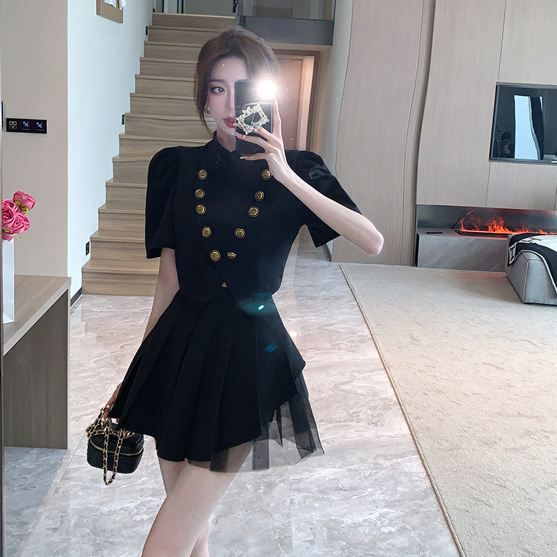 | nameOriginal | Summer New French Style Fragrant Puff Sleeve Celebrity Vertical Collar High Waist Pleated Skirt Stitching Mesh Skirt Two-Piece Set |