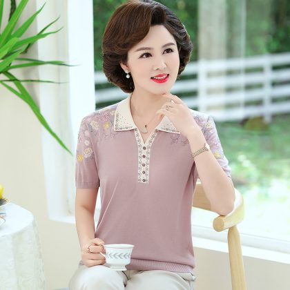 | nameOriginal | Summer New Middle-aged Mother Square Collar Ice Silk Embroidered Top Breathable Women's plus size Knitted Short-sleeved Shirt |