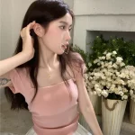 | nameOriginal | Summer new mint Mambo square neck pleated design short-sleeved knitted T-shirt women's solid color top with chest pad |