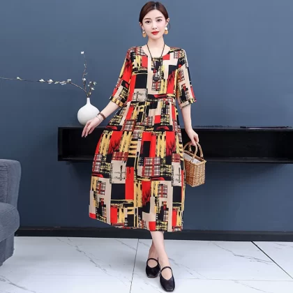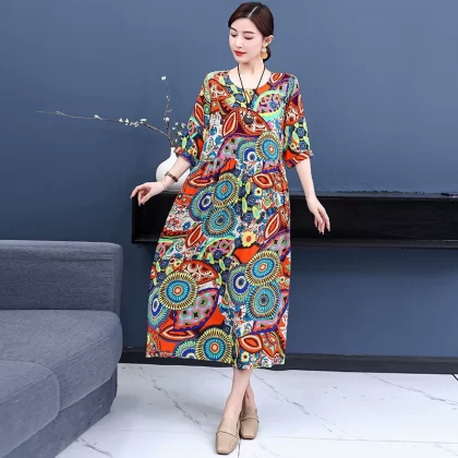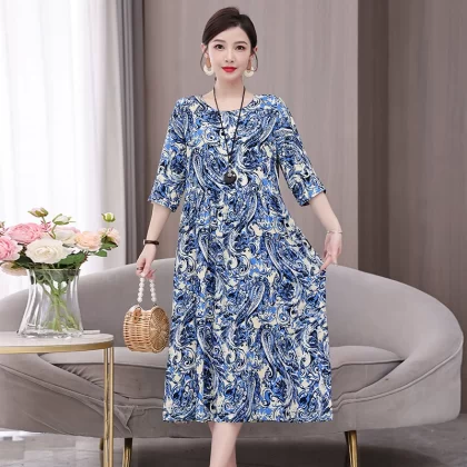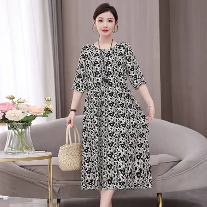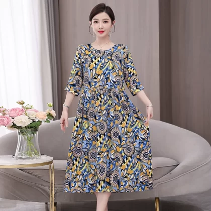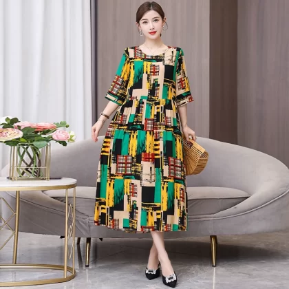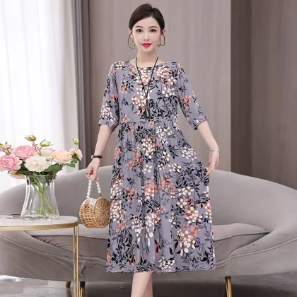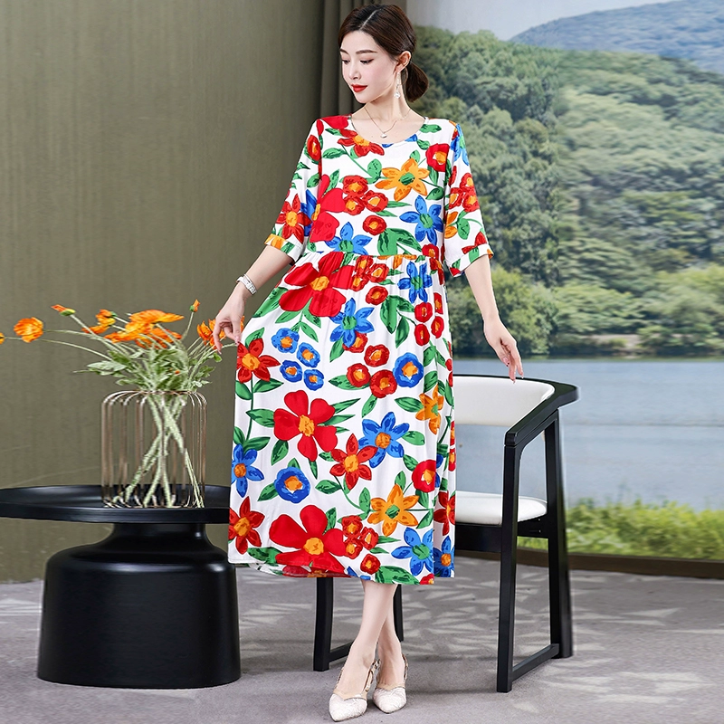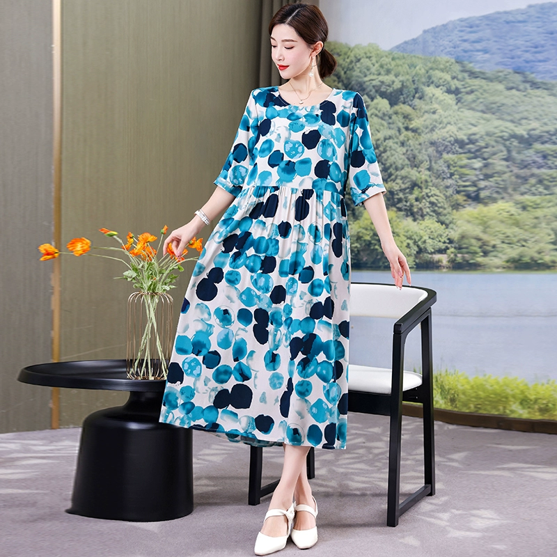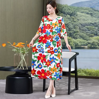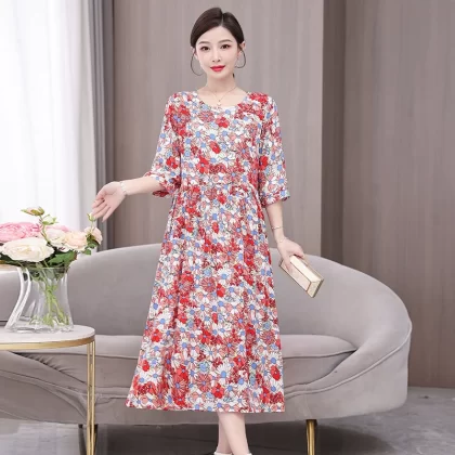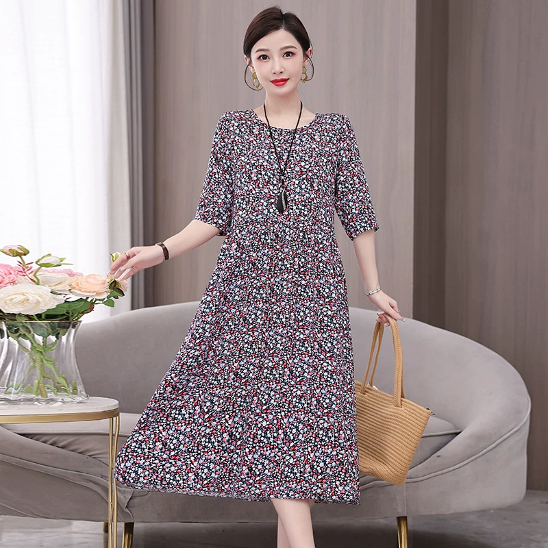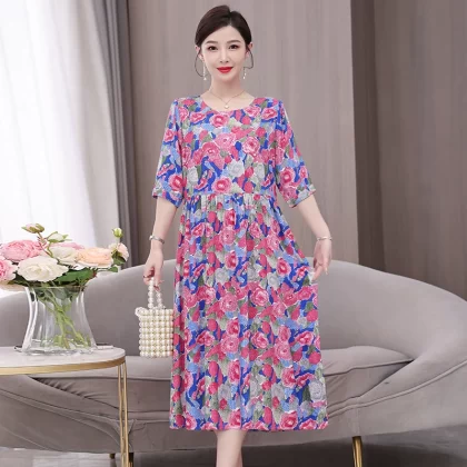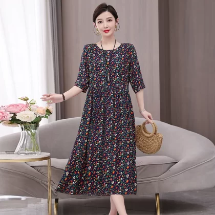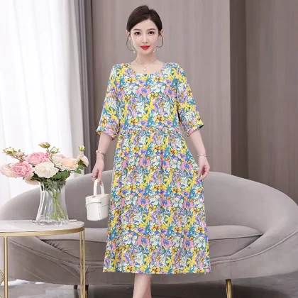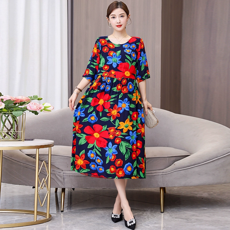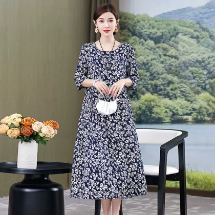 | nameOriginal | Summer new mother's wear cotton silk mid-sleeve dress women's fashion loose middle-aged and elderly artificial cotton outer wear long skirt |