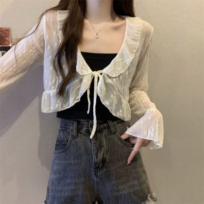 | nameOriginal | Summer New Ruffled Lace-up Sunscreen Cardigan Women's Elegant Holiday Style Small Shawl Blouse Thin Jacket |