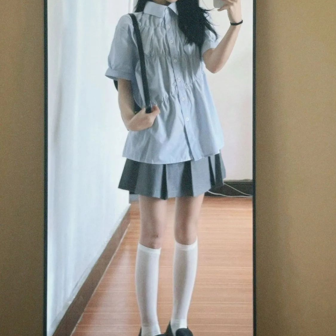 Summer New Style Little Man College Style Two-piece Suit Women's Blue Pleated Shirt Top Women's High Waist Pleated Skirt